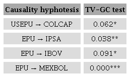 These results demonstrate the impacts of news, reports from CBO and surveys from FED-P in the US and how they are transmitted over time to stock markets in Latin America. Regarding the time-varying irf, as time passes the effect of the shock is similar in all the indices, although the magnitude of the shocks for IPSA and IBOV are higher in the initial periods of 2002-2010 while for COLCAP and MEXBOL are higher in the initial periods of 2011-2020. Finally, in order to corroborate these results, the tv-gc corroborated the findings from the irfs. The results show that the USEPU Granger-causes the Latin American stock market returns at least at one point in time.