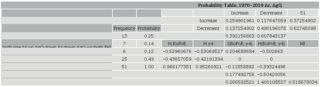 The MI statistic (Shannon, 1948) is a measure of entropy. It calculates the reduction of uncertainty in the change of the rate of growth of output (ΔgQ) and GDP (ΔgGDP) when we know the change in the net rate of profit (Δr). Its advantage over the Pearson coefficient is that it does not assume a linear relationship between the two variables. To calculate probabilities, I identified four different states: 1) both variables increase, 2) Δr > 0 while the other variable falls, 3) Δr < 0 while the other variable increases, 4) both variables fall. If all observations fall under states 1 and 4 then MI ( 1 and when they fall under 2 and 3 MI ( 0. Having said all this it is clear that changes in the rate of profit are very closely associated with changes in output growth and also indicate a significant association with changes in GDP growth. The calculations are summarized in Annex 2.