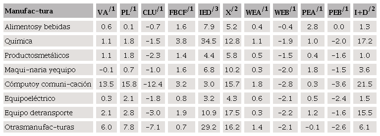 El proceso de integración comercial que siguió México provocó un rápido crecimiento de las exportaciones manufactureras; las industrias de equipo de transporte, computo, equipo eléctrico, química y maquinaria y equipo, son los ejes primordiales de la producción de exportación, alrededor del 65% de la exportación total. De igual forma, poco menos del 50% de la IED captada se concentra en el sector manufacturero, los subsectores de cómputo y de transporte son los principales destinos. En este contexto, un interrogante básico es ¿cuál ha sido el impacto efectivo del cambio de régimen sobre la expansión industrial, la eficiencia y las remuneraciones? En general, la actividad manufacturera evidencia una marcada desarticulación productiva, ganancias en productividad restringidas, un proceso de contención salarial y de absorción de mano de obra principalmente con escolaridad baja-media. Asimismo, hay que destacar que la inversión de las empresas en I+D ha sido limitada (véase el cuadro 1).