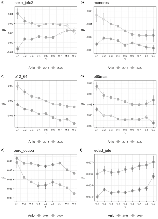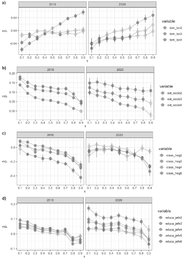 El modelo de regresión cuantil definido en la ecuación [3] se estimó usando la librería quantreg (Koenker, 2021) del software estadístico R (R Core Team 2021). Un punto importante es que, a diferencia de los trabajos previos sobre este tema, en este artículo tomamos en cuenta la variable “factor” que representa el factor o peso de representatividad de cada hogar en la base de datos. Lo anterior permite generalizar los resultados obtenidos a todo el universo de hogares mexicanos, y esto es gracias a que la ENIGH es una encuesta de tipo probabilística (INEGI, 2018; INEGI, 2020). La forma más sencilla de incorporar el factor de expansión en los modelos de regresión es a través del argumento weights que la mayoría de los paquetes estadísticos pone a disposición del usuario (utilización directa). Sin embargo, no es la única alternativa, también se les puede considerar como “variables de control”. Estos dos enfoques son motivo de debate entre la comunidad de estadísticos y econometristas (West, Sakshaug y Aurelien, 2016). En el presente estudio optamos por la primera alternativa por ser la más práctica, aunado a que el modelo de regresión cuantil destaca por ser robusto (incluida la estabilidad en la estimación de las varianzas de los coeficientes de regresión) a diferencia de la regresión en la media (regresión normal o por mínimos cuadrados ordinarios).