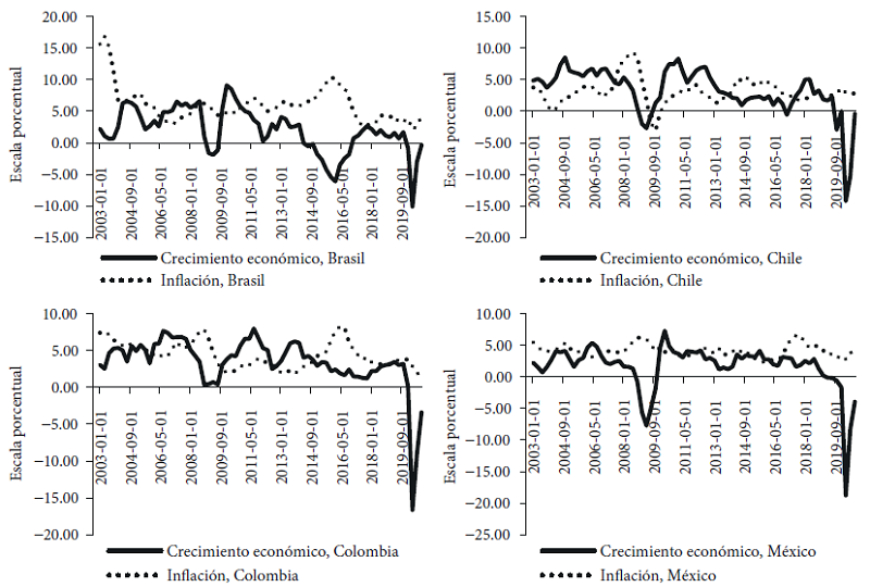 De esta manera, es posible evaluar los resultados macroeconómicos que se han producido a partir de la adopción del modelo de metas de inflación desde finales del siglo XX en el conjunto de economías latinoamericanas antes expuesto. Esta evidencia empírica corresponde al periodo entre el primer trimestre de 2003 y el cuarto trimestre de 2020.