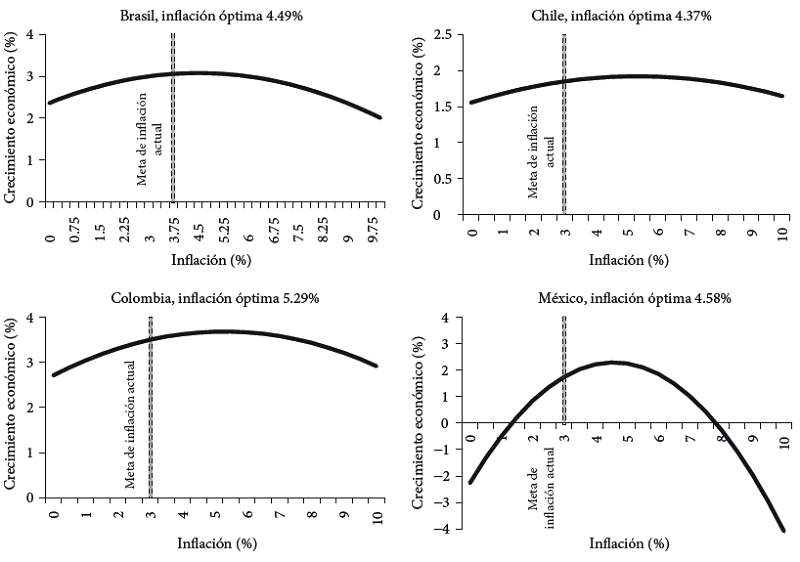Así, para Brasil se puede apreciar que la inflación óptima para el crecimiento económico es 4.49%, 74 puntos base más que el objetivo puntual actual, mientras que el intervalo de flexibilidad se sugiere entre 3.17% y 5.82%. Por consiguiente, para el caso de Brasil se comprueba que el seguimiento de política monetaria actúa de forma premeditada al tolerar exclusivamente tasas de inflación de 5.25%, cuando el spread puede ser poco más de medio punto porcentual. En Chile, la estimación de inflación óptima es 4.37%, es decir, poco más de 1% que el objetivo puntual actual; el objetivo del Banco Central de Chile igualmente fomenta de forma apresurada el uso de la regla monetaria y se mueve en un amplio rango de tasas de inflación.