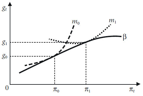 La figura 1 considera a β como la relación positiva entre crecimiento e inflación suave, mientras que m0 representa la función de utilidad de los formuladores de política económica; por consiguiente, la intersección entre g0 y π0 refleja el equilibrio entre las preferencias de seguimiento de política inflacionaria, así como la prevención y antipatía a niveles de crecimiento generalizado de precios más elevados. Asimismo, dada la conjetura de que β es fija, las políticas con predilección al crecimiento se expresarían mediante un desplazamiento de las preferencias de m0 a m1 en las que, si bien la economía experimenta una aceleración inflacionaria, lo mismo ocurre con su tasa de crecimiento económico. En particular, este enfoque teórico significa que es necesario liberar recursos en fomento del crecimiento y el desarrollo mediante la inversión por encima de los planes de ahorro. De esta manera, se constituyen los objetivos primordiales de las políticas de desarrollo al elevar la tasa de crecimiento económico, los niveles de consumo y suministrar los recursos para la inversión y el consumo futuro. En este sentido, Thirlwall repara en que la tasa de crecimiento de las economías dependerá del aumento de la fuerza de trabajo (l), así como de su productividad (t), y que esta última se deriva de la acumulación de capital y el progreso técnico en el sentido más amplio. Este principio se presenta por medio de la ecuación [1]: