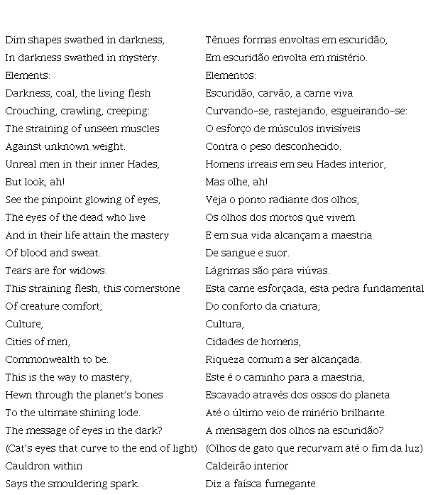 Este poema retrata explicitamente a carne invisível e tensa das formas desumanizadas trabalhando nas trevas como “a pedra fundamental do conforto da criatura; / Cultura / Cidades de homens, / Riqueza comum a ser alcançada”. É escrito a partir da perspectiva de um daqueles “mortos que vivem”, um dos “homens irreais em seu Hades interior”, e é justificadamente crítico das gritantes desigualdades da Grã-Bretanha dos anos 1930, desigualdades que permitem que as “pessoas reais” na superfície desfrutem dos frutos do trabalho exaustivo dele e de seus colegas trabalhadores.