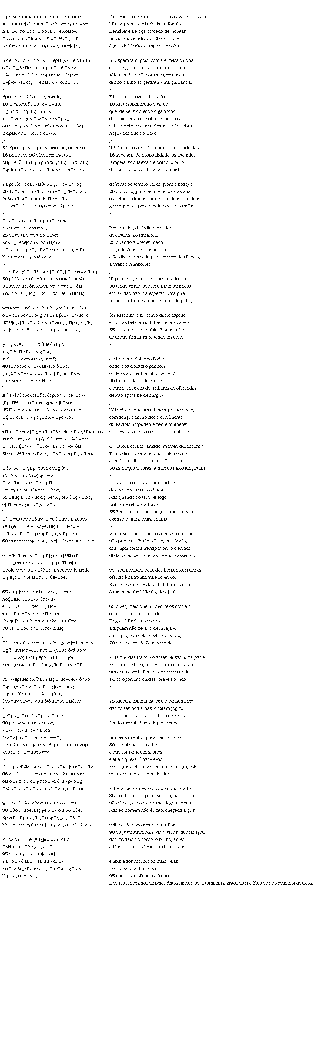 vv. 92-95: Ἰέρων, σὺ δ’ ὅλβου (…) οὐ φέρει κόσμ[ον σι]ωπά – O nome de Hierão (um name cap, segundo Bundy, 1962, p. 5-6, n. 18 ) recorre no fim da ode em companhia de uma de suas palavras-chave, ólbos, “fausto”, “dita”, como já comentamos e, de certa forma, resume o seu assunto, além de oferecer uma dica para a audiência de que a ode está chegando ao fim (Maehler, 2004, p. 98). Cf. o paralelo aduzido por Kenyon (1897, p. 29) em Sófocles, Ájax, v. 293, γυναιξὶ κόσμον ἡ σιγὴ φέρει.