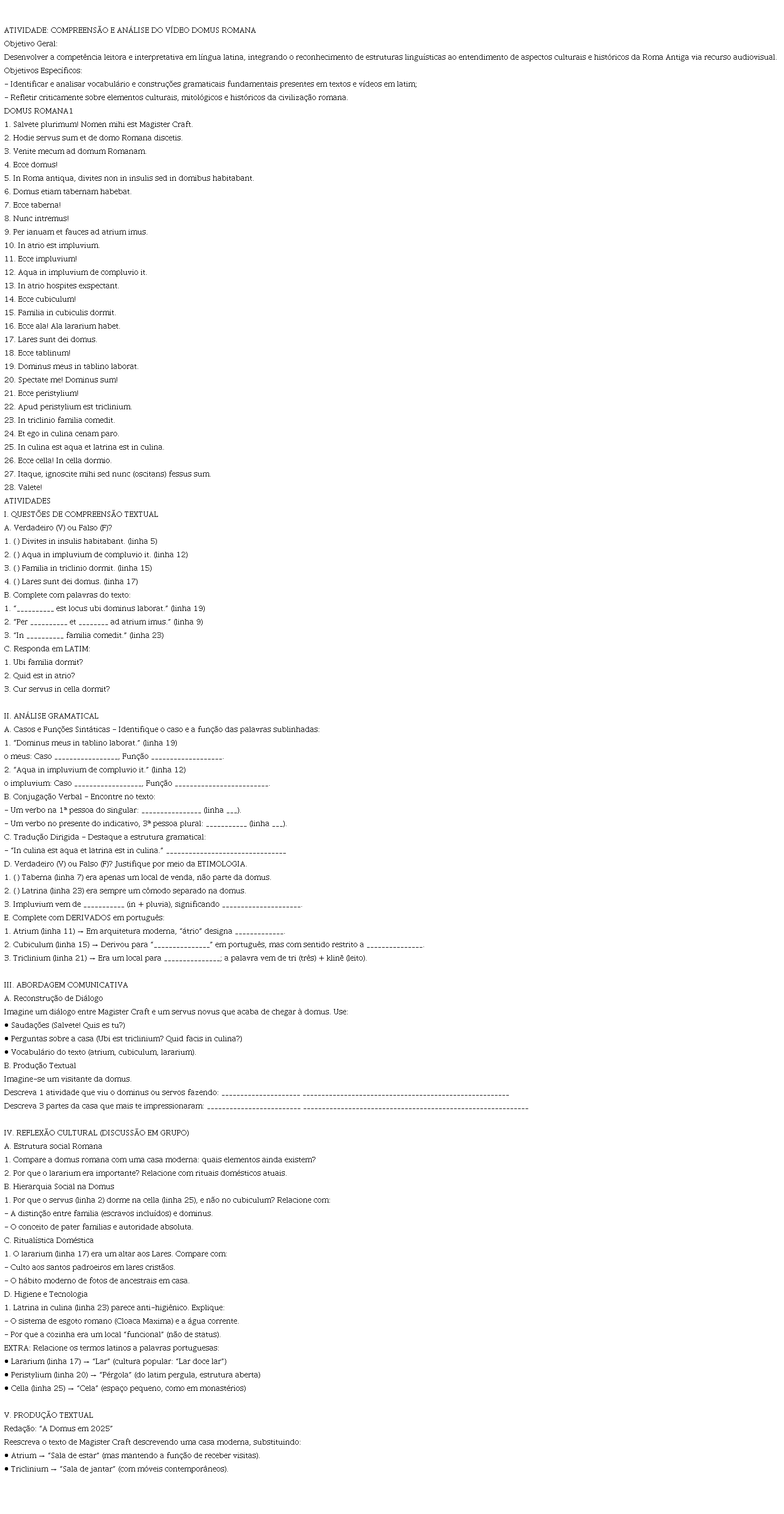 Sabe-se que conteúdos como vocabulário, gramática e aspectos histórico-culturais e literários tendem a ser mais eficazmente assimilados quando mediados por ações didáticas inovadoras. O uso pedagógico do canal Divus Magister Craft no processo de ensino-aprendizagem de Língua e Literatura Latina, tanto em contextos formais de ensino quanto em espaços de autodidatismo e diletantismo, pode gerar resultados significativos, especialmente quando dialoga com paradigmas contemporâneos que tratam o latim como uma língua historicamente viva.