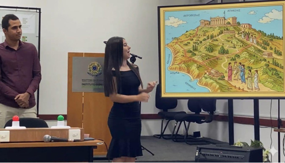 A interdisciplinaridade foi uma das marcas mais visíveis do projeto. As oficinas de geografia antiga, por exemplo, articularam o conhecimento espacial com o simbólico: os alunos reconstruíram, com base em mapas e fontes iconográficas, o percurso das mulheres atenienses rumo à Acrópole, compreendendo a topografia como elemento dramatúrgico.