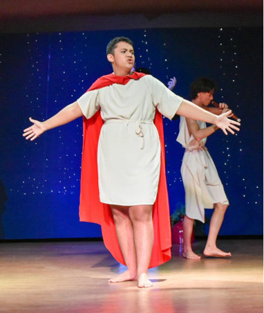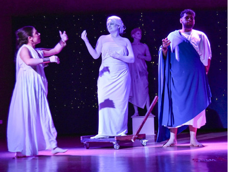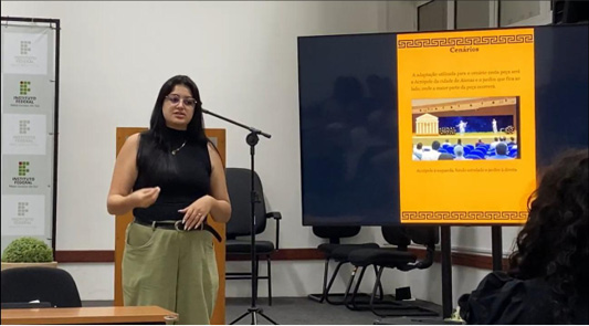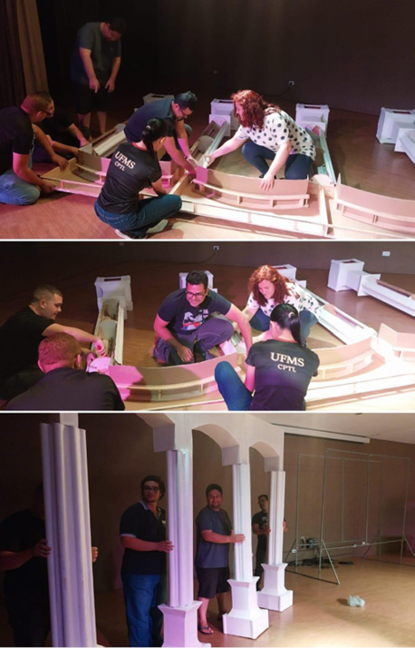 No campo do design cênico – que abrange figurino, caracterização e cenografia – a apresentação das pesquisas sobre vestuário, maquiagem e penteados, bem como o planejamento e a oficina de construção do cenário, evidenciou o diálogo entre artes, arqueologia e criação estética. Inspirando-se em imagens de vasos áticos e relevos do século V AEC, o grupo desenvolveu elementos cenográficos que evocavam as colunas da Acrópole, reinterpretadas por meio de materiais contemporâneos e soluções criativas.