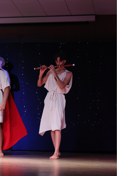 O auge da construção sonora ocorreu no desfecho da peça, no momento em que o poeta espartano toma a cena e recita seus versos acompanhado de uma flauta desafinada, parodiando o famoso tema de Titanic que se tornou viral na internet. Essa escolha – deliberadamente cômica e anacrônica – provocou gargalhadas no público, quebrando a solenidade da cena e reforçando o espírito paródico da comédia antiga. A “flauta desafinada”, símbolo da cultura meme, foi incorporada como signo da contemporaneidade digital, mostrando que o riso continua sendo um instrumento de crítica social e de comunhão coletiva.