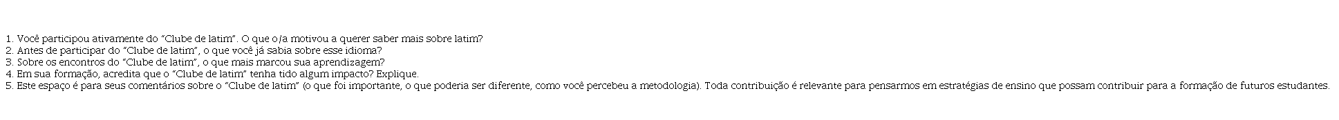 Passados quase dez anos dessa experiência construída em parceria com os discentes, alguns dos mais assíduos no projeto foram convidados a compartilhar sua percepção sobre o Clube de Latim, através de um formulário eletrônico. A intenção dessa inquirição não almejou constituir uma pesquisa quantitativa ou qualitativa, ancorada em uma rigorosa estrutura metodológica de verificação. Buscou somente endossar o pressuposto de que o ensino de língua latina no Ensino Básico é uma prática que, além de factível, pode trazer benefícios ao desenvolvimento do aluno. Os relatos espontâneos reforçam algo que, a princípio, não se constituía como uma meta ou mesmo uma possibilidade a ser pensada no que se refere a um provável espaço a ser ocupado (ou reocupado) pelo latim no ensino básico. Todavia, o processo de organização dos encontros, a resposta dos participantes e o posterior contato com a pesquisa (que existe!) sobre o tema tornaram evidente e necessária a iniciativa de incluir, tanto quanto possível, os estudos clássicos na dinâmica da escola.