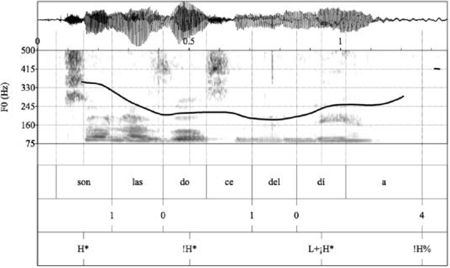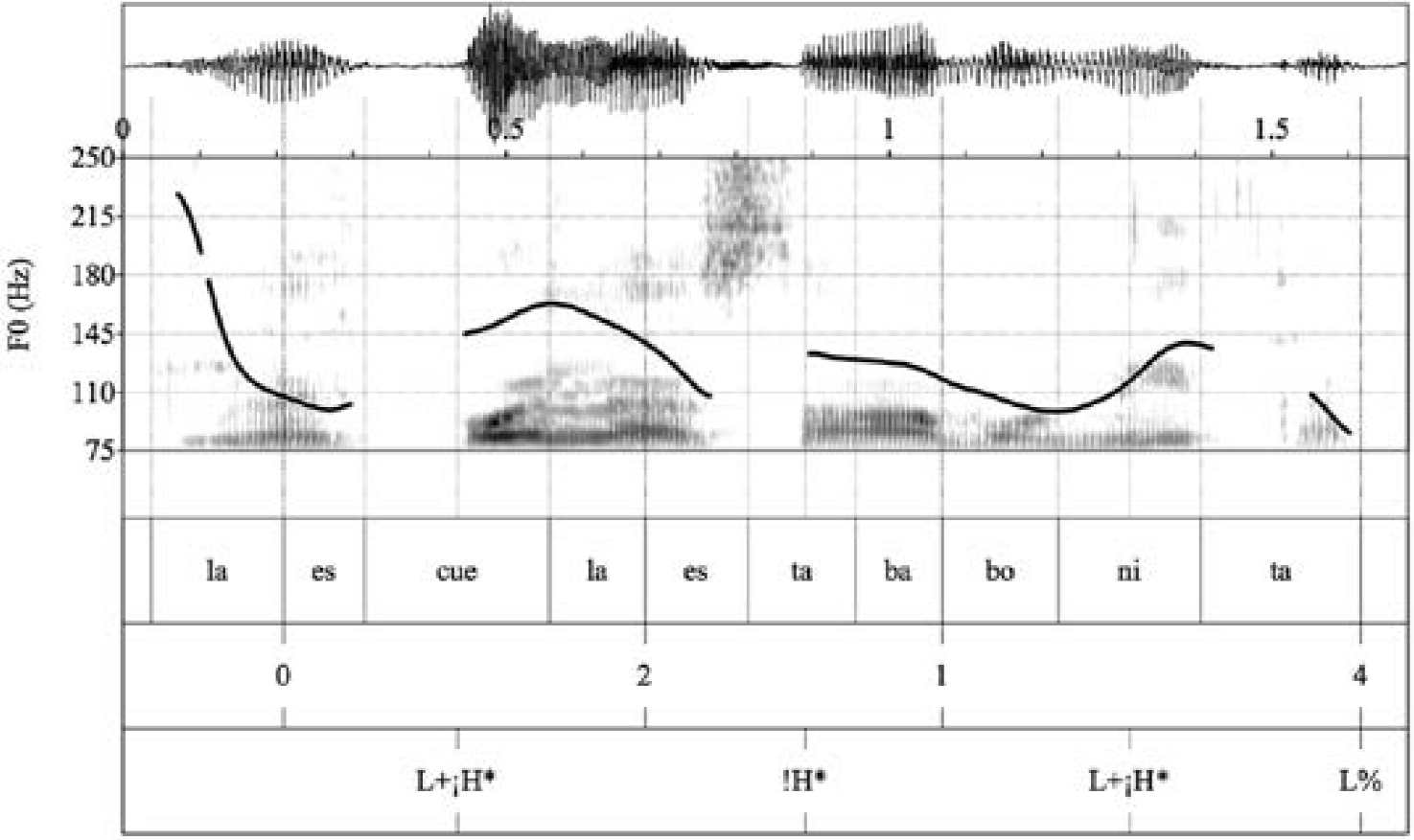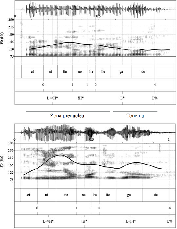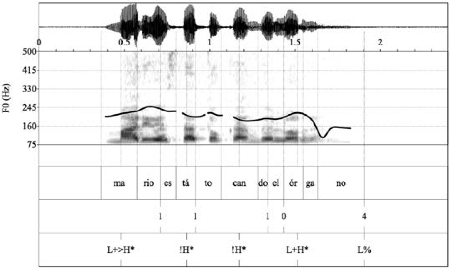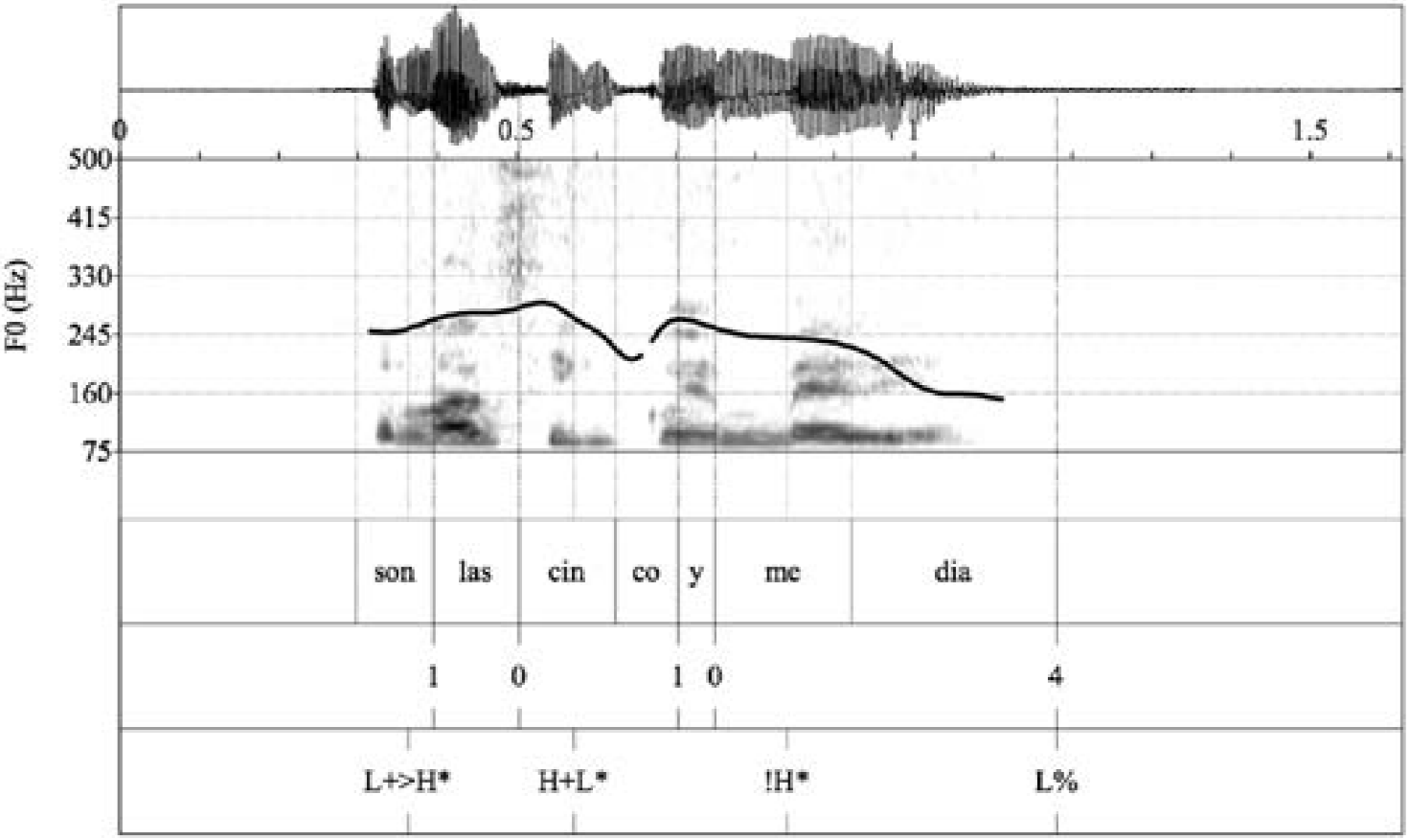 En este enunciado, el acento nuclear L+H* muestra un ligero movimiento ascendente, con valor de 1.5 st, que contrasta con los movimientos prominentes de hasta 7 st registrados en datos de habla espontánea. Otra diferencia se nota en el pretonema con la realización del acento tonal con pico desplazado hacia la postónica L+>H* (véase el siguiente apartado para la discusión acerca de este acento). En la configuración global, se observa que el descenso entre el punto más alto del enunciado y el tonema es menos pronunciado en comparación con las emisiones de habla espontánea.