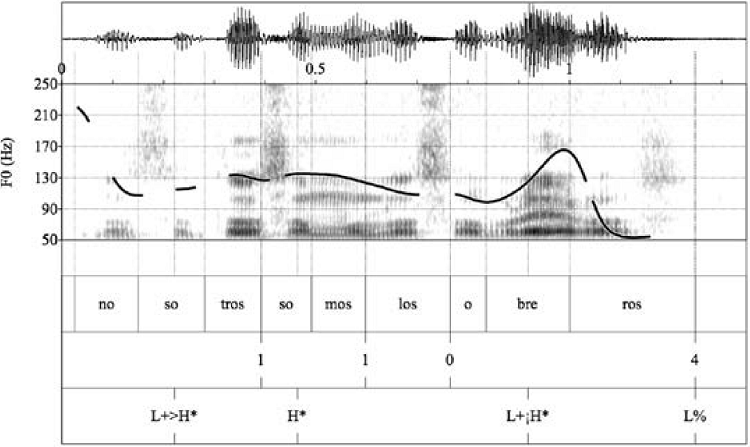 En términos del modelo métrico-autosegmental y el sistema de notación prosódica Sp_ToBI, el inicio en tono medio, la elevación progresiva de la curva melódica y su culminación en la sílaba postónica corresponden al acento tonal L+>H* -pico tonal desplazado4. El descenso en el tonema del enunciado se describiría con la configuración L* L% (véase infraFigura 1). Esta descripción coincide con la configuración propuesta para los enunciados aseverativos de foco amplio (broad focus statements) registrados en la variedad de la Ciudad de México, con el desplazamiento del primer pico tonal L+>H* y el tonema L* L% (De-la-Mota et al. 2010)5.