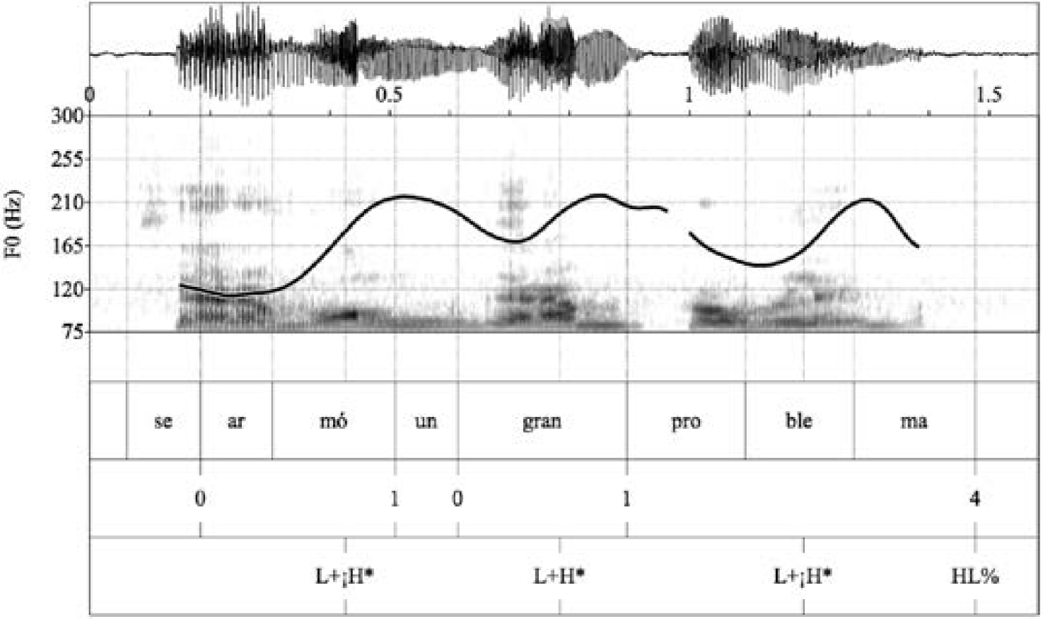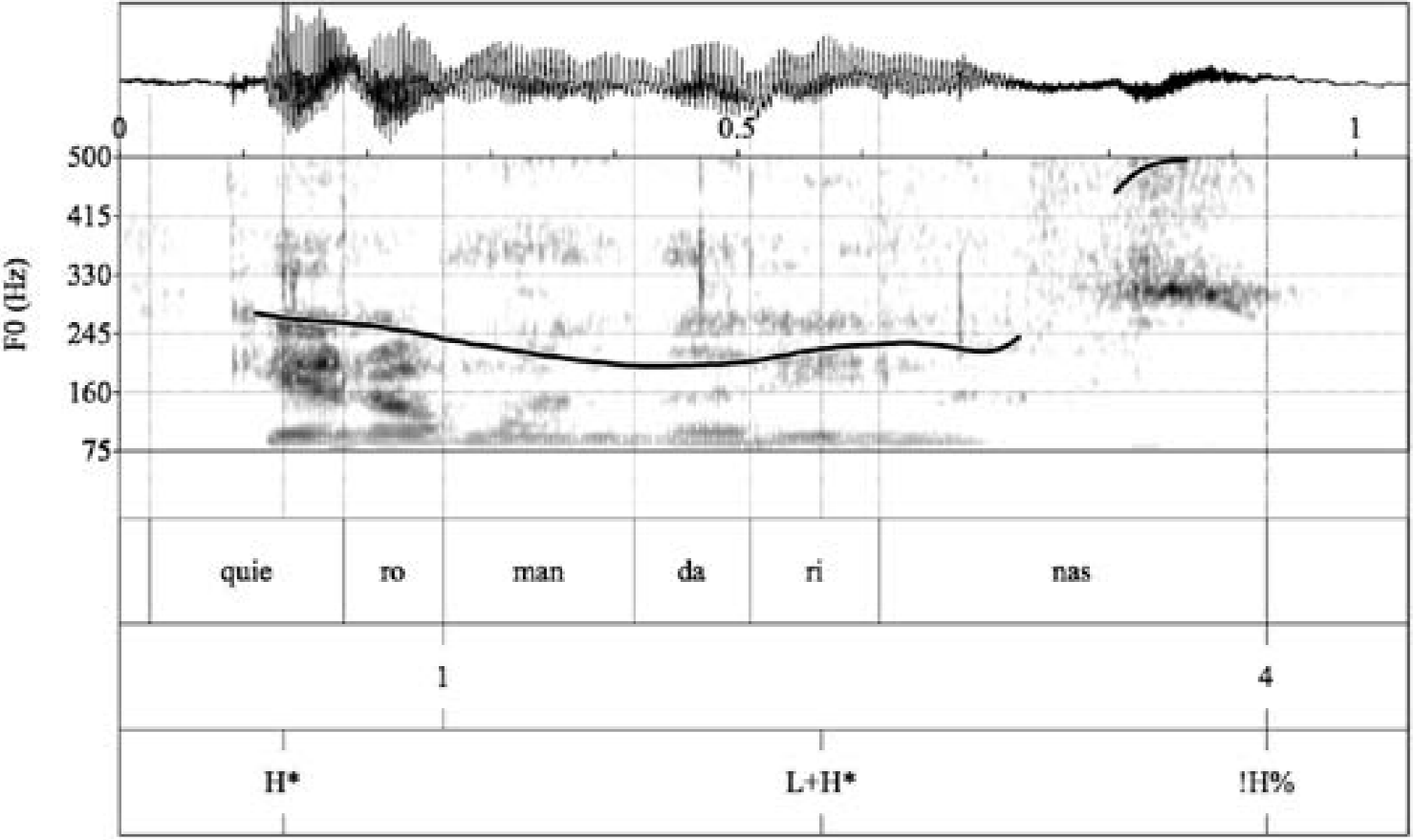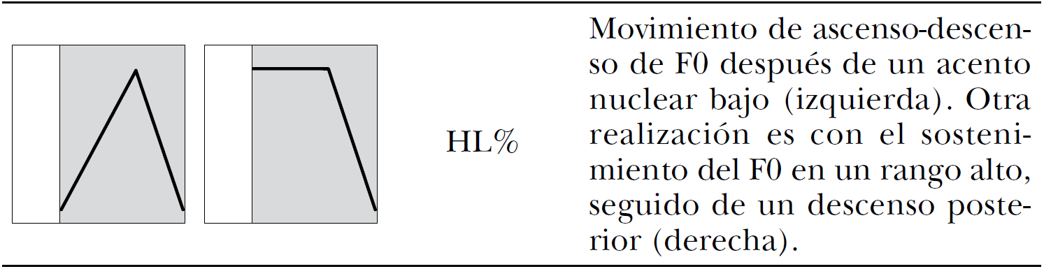 Además, se registra una configuración nuclear L+¡H* HL% con una juntura compleja. El descenso final es similar al de la forma L%, pero el pico tonal del acento nuclear continúa su trayectoria ascendente en la primera parte de la sílaba postónica, como se puede apreciar en la Figura 3.