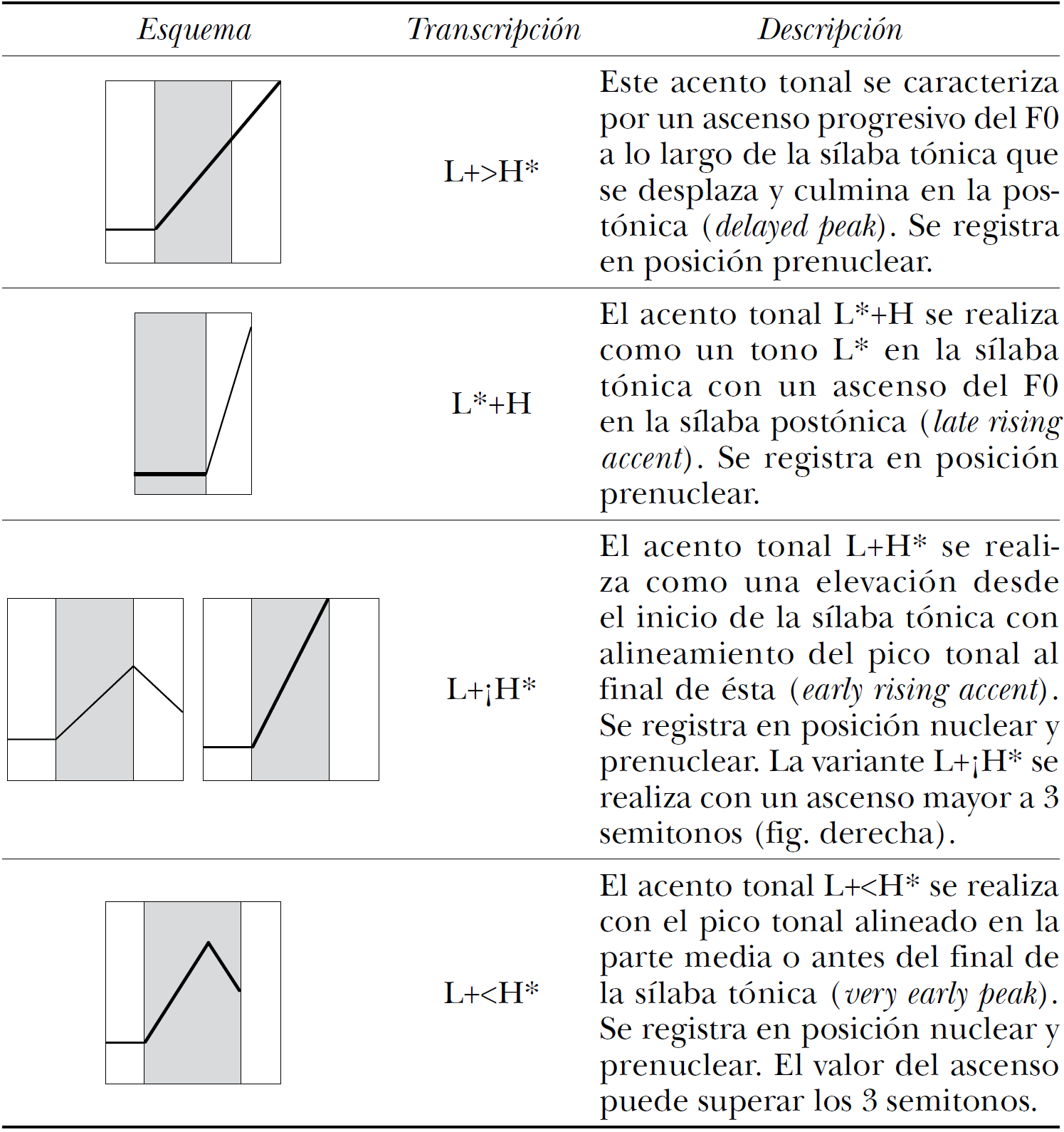 Cabe señalar que tanto en la propuesta de Beckman et al. (2002), como en la de Hualde y Prieto (2015), se ha empleado la notación L+<H* para la transcripción del acento tonal con alineamiento en la sílaba postónica. En este trabajo se seguirá la propuesta de Estebas Vilaplana y Prieto (2008) para la transcripción del acento tonal con pico diferido (o desplazado) con la notación L+>H* (delayed peak). Para la descripción de los datos de Tuxtla, se considera que el uso de esta notación permitirá distinguir el desplazamiento en posición prenuclear, frente a la realización documentada con el pico tonal alineado antes del linde de la sílaba tónica, etiquetado como L+<H*, según se observa en la Tabla 3.