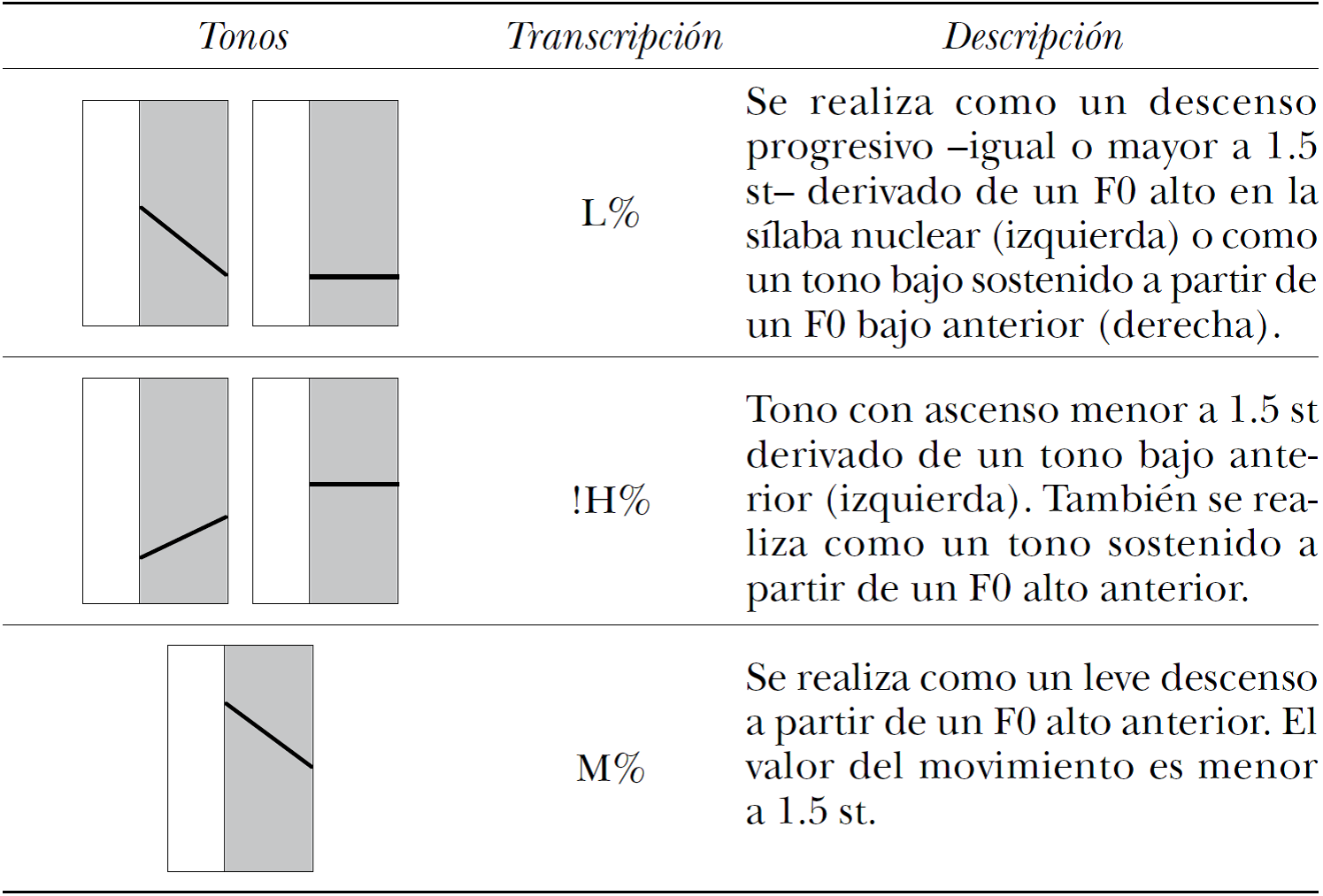 Los datos se analizan a la luz del modelo métrico-autosegmental11 (Pierrehumbert 1980; Sosa 1999; y Ladd 2008); para su transcripción, se utiliza el sistema de notación prosódica Sp_ ToBI (Beckman et al. 2002; Estebas Vilaplana y Prieto 2008; Hualde & Prieto 2015). La propuesta de acentos tonales y tonos de juntura tiene una base fonética, para la que se ha considerado el umbral de percepción de 1.5 semitonos (Pamies et al. 2001; Murrieta 2016).