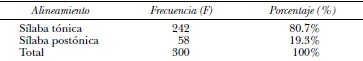 Los datos de la Tabla 10 exponen la mayor recurrencia de acentos tonales alineados en la sílaba tónica, es decir que el alineamiento temprano se documenta en un 80.7%, mientras que la realización con alineamiento en la sílaba postónica sólo se registra en un 19.3% de los casos. Estos resultados indican que el prealineamiento no se produce de manera categórica.