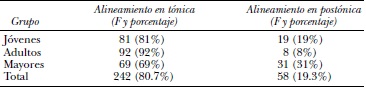 La distribución del alineamiento del acento tonal por grupos de edad indica que el conformado por adultos (35 a 54 años) concentra la mayor frecuencia y porcentaje de acentos tonales con pico alineado en la sílaba tónica. Por el contrario, se observa una disminución de esta realización en los datos de los grupos de edad integrados por los jóvenes y mayores. En lo que respecta al alineamiento en la sílaba postónica, la mayor cantidad de ocurrencias se concentra en las emisiones del grupo de edad atinente a mayores, seguido por el de los jóvenes.