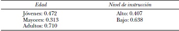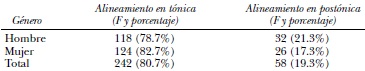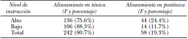 En relación con el género, los porcentajes muestran una distribución semejante de ocurrencias en los datos de hombres y mujeres. La diferencia en el alineamiento en la sílaba tónica es de 4% a favor de los datos producidos por mujeres, y esta misma diferencia se observa en los datos con alineamiento en la postónica, con mayoría en las emisiones de los hombres. El último factor, nivel de instrucción, revela el mayor porcentaje de alineamiento en la sílaba tónica en las emisiones de los informantes de nivel de instrucción bajo; sin embargo, en los datos del nivel de instrucción alto se muestra un elevado porcentaje de ocurrencias de alineamiento temprano. Esta distribución de datos podría apoyar la propuesta del alineamiento del primer pico tonal como un rasgo que distingue a la variedad de Tuxtla Gutiérrez.