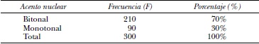 En tablas se ofrece la información acerca de la distribución de acentos nucleares en los enunciados aseverativos de la variedad de Tuxtla. Los datos de la Tabla 6 dan cuenta de la mayor frecuencia de acentos nucleares bitonales (210 casos en la muestra de 300 enunciados), mientras que en la Tabla 7 se registra la frecuencia de acentos bitonales con ascenso superior a 3 st.