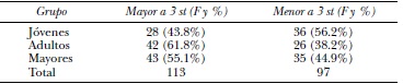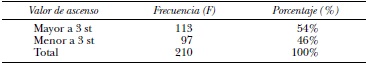 En una primera aproximación a los datos, se distinguieron los porcentajes de la frecuencia de los distintos ascensos por grupos de edad (Tabla 8) y se notó que los ascensos con valor superior a 3 semitonos se registran con mayor recurrencia en los datos obtenidos del grupo de adultos y mayores, y disminuyen en las emisiones de los jóvenes.