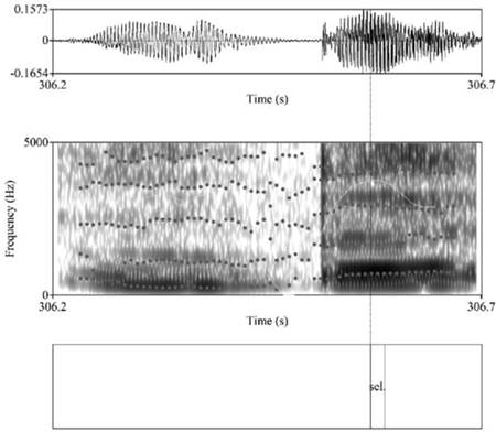 El autor escuchó el audio en Praat (Boersma & Weenink 2016), y cuando identificó [V], [Vs], [Vr] y [Vθ], pausó la grabación y analizó el espectrograma de la vocal relevante midiendo solamente los valores de los formantes F1 y F2 durante su sección estable. Tras localizar la porción estable de cada vocal, se tomó la media de F1 y F2 ejecutando los comandos Formant/ Get first formant y Formant/Get second formant.