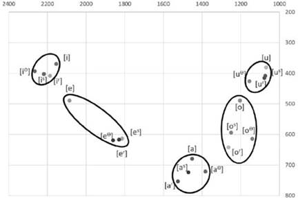 Se redondearon los valores de los formantes para evitar usar decimales (v.gr. 613’7 se convirtió en 614, y 2134’2, en 2134). Los valores obtenidos se incorporaron a una hoja de cálculo Excel; luego, se agruparon los resultados para cada realización de /i/, /e/, /a/, /o/ y /u/; posteriormente, se calculó la media y la desviación estándar para el F1 y el F2. Estos resultados se presentan en la sección correspondiente a “Experimento de percepción” (cf. infra).