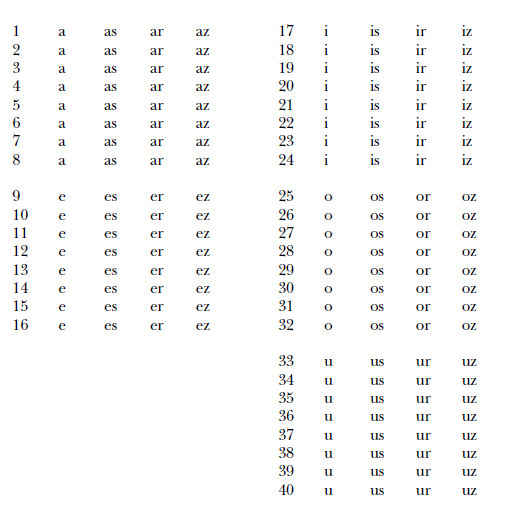 el andaluz oriental tiene catorce vocales en posición final de palabra: [i], [is/r/θ], [e], [es/r/θ], [a], [as], [ar], [aθ], [o], [os], [or], [oθ], [u] y [us/r/θ];