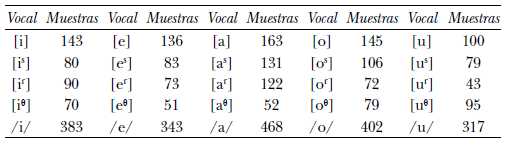Igualmente se descartaron las vocales que aparecían junto a otras en la cadena hablada (v.gr. pies [pje̞ s] o decir a [deˈθi̞ r a]) para evitar analizar vocales afectadas por distintos fenómenos coarticulatorios.