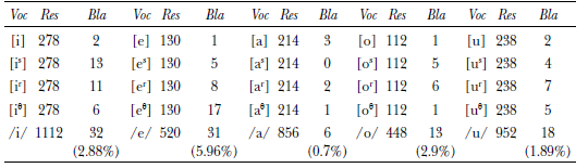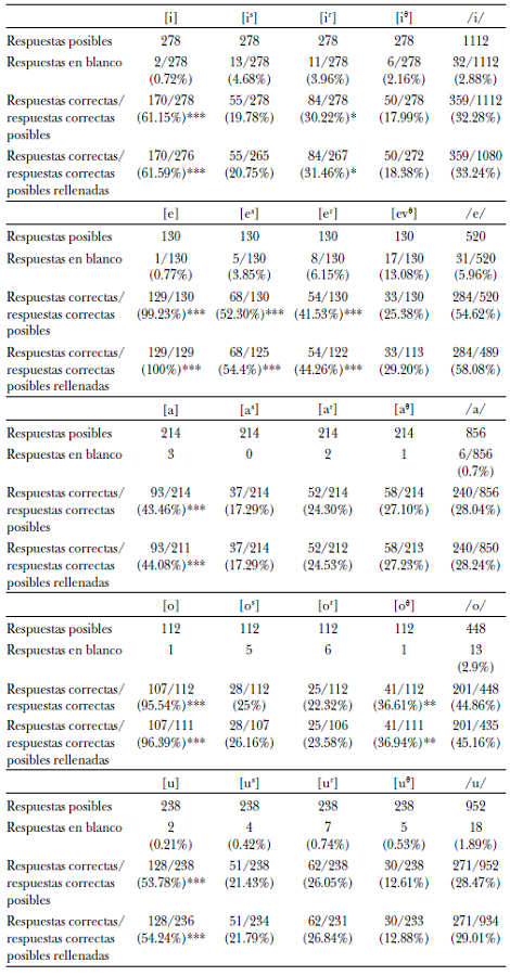 El dejar respuestas en blanco, en vez de adivinarlas, demuestra la fiabilidad de los participantes. Igualmente, como se expli ca en Herrero de Haro 2016, incluso [i] y [e] no se distinguen perceptivamente entre sí en el total de los casos.