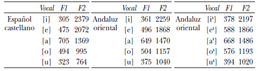 La Tabla 2 contiene información sobre los valores medios de los formantes F1 y F2 para las cinco vocales del español. Las vocales analizadas son /i/, /e/, /a/, /o/ y /u/ en español castellano e /i/, /e/, /a/, /o/ y /u/ en posición final y ante /-s/ subyacente en andaluz oriental. Los valores han sido recopilados de varios trabajos y el lector interesado puede ver las cifras de cada autor para cada alófono vocálico en Herrero de Haro 2016, 2017, 2017b, 2019 y en prensa. Los valores han sido redondeados para evitar usar decimales.