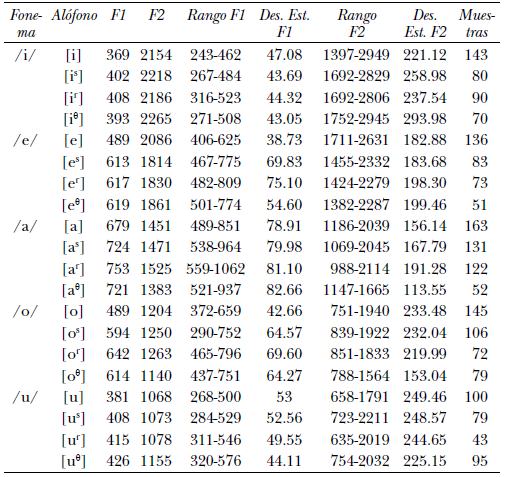 La siguiente tabla resume los resultados obtenidos en el análisis acústico de 1 913 vocales en los contextos [V], [Vs], [Vr] y [Vθ]. Los datos presentados en este artículo para /e/, /o/, /a/, /i/ y /u/ han sido tomados, respectivamente, de Herrero de Haro 2016, 2017, 2017b, 2019 y en prensa, aunque los datos para /e/ y /o/ varían ligeramente de los presentados en Herrero de Haro 2016 y 2017, al haber aumentado el número de muestras analizadas para el presente estudio.