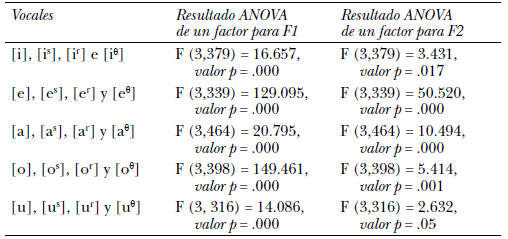 En primer lugar, se analizaron los valores del F1 y del F2 para cada una de las cuatro realizaciones de /i/, /e/, /a/, /o/ y /u/. Para esto, se realizó una prueba ANOVA de un factor y se obtuvieron los resultados que figuran en la Tabla 4, los cuales confirman que las diferencias en cuanto al F1 y el F2 de [V], [Vs], [Vr] y [Vθ] son estadísticamente significativas para /i/, /e/, /a/, /o/ y /u/, ya que el valor p es igual o menor que 0.05 en todos los casos.