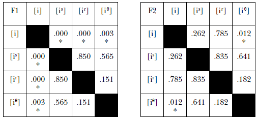 Como se puede apreciar en la Tabla 5, la diferencia respecto al F1 de las cuatro realizaciones de /i/ es estadísticamente significativa en los pares de vocales [i] [is], [i] [ir] e [i] [iθ], pero no en los pares [is] [ir], [is] [iθ] e [ir] [iθ]. En cambio, los resultados de la Tabla 5 sugieren que el único contraste estadísticamente significativo en cuanto al F2 es [i] [iθ]. Teniendo en cuenta los resultados presentados en la tabla, de entre los seis posibles contrastes de /i/ ([i] [is], [i] - [ir], [i] - [iθ], [is] - [ir], [is] - [iθ] e [ir] - [iθ]), solamente son estadísticamente significativos los con- trastes [i] - [is], [i] - [ir] e [i] - [iθ]. Esto sugiere que, aunque las apócopes de /s/, /r/ y /θ/ cambian la calidad de una /i/ pre- cedente en distinto grado, esas diferencias no son estadísticamente significativas. Por lo tanto, podemos hablar sólo de dos alófonos de /i/: /i/ en posición final ([i]) e /i/ ante /s/, /r/ o /θ/ apocopada ([is/r/θ]).