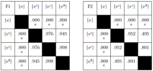 Según los datos de la Tabla 6, las únicas diferencias estadísticamente significativas en cuanto al F1 de [e], [es], [er] y [eθ] son las de los contrastes [e] - [es], [e] - [er] y [e] - [eθ], con las diferencias del F1 sin ser estadísticamente significativas entre [es] - [er], [es] - [eθ] y [er] - [eθ]. El resultado para el F2 de [e], [es], [er] y [eθ] es exactamente igual que para el del F1, por lo cual podemos afirmar que, aun cuando la calidad de /e/ cambie, dependiendo de si precede a /s/, /r/ o a /θ/ subyacente, esa diferencia de calidad no es estadísticamente significativa. Esto confirma que podemos hablar de dos alófonos de /e/: /e/ en posición final de palabra ([e]) y de /e/ ante /s/, /r/ o /θ/ subyacente ([es/r/θ]).