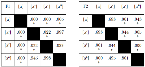 La Tabla 7 muestra cómo la diferencia en cuanto al F1 es estadísticamente significativa en los contrastes [a] - [as], [a] - [ar], [a] - [aθ] y [as] - [ar], pero no en los contrastes [as] - [aθ] o [ar] - [aθ]. En cuanto al F2, el análisis estadístico confirma que las diferencias respecto al F2 son estadísticamente significativas en los contrastes [a] - [ar], [a] - [aθ], [as] - [ar], [as] - [aθ] y [ar] - [aθ], pero no en el contraste [a] - [as]. Sin embargo, la diferencia en cuanto al F1 para el contraste [a] - [as] sí es estadísticamente significativa, por lo que podemos afirmar que el andaluz oriental tiene cuatro alófonos de /a/ en posición final de palabra: /a/ en posición final ([a]); /a/ ante /s/ final subyacente ([as]); /a/ ante /r/ final subyacente ([ar]); y /a/ ante /θ/ final subyacente ([aθ]).