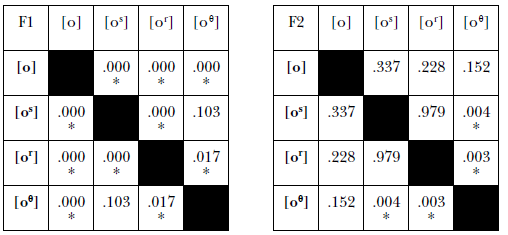 Los resultados del análisis de /o/ que aparecen en la Tabla 8 indican que en lo que respecta a F1, las diferencias son estadísticamente significativas entre los contrastes [o] - [os], [o] -[or], [o] - [oθ], [os] - [or] y [or] - [oθ], pero no en el contraste [os] - [oθ]. La situación es distinta en cuanto al F2, con la diferencia estadísticamente significativa en los contrastes [os] - [oθ] y [or] - [oθ] y no en los contrastes [o] - [os], [o] - [or], [o] - [oθ] o [os] - [or]. Teniendo en cuenta la información de la Tabla 7, podemos sostener que las cuatro realizaciones de /o/ analizadas son estadísticamente distintas entre sí, ya que el único contraste que no se diferencia estadísticamente en cuanto al F1 ([os] - [oθ]) sí es estadísticamente distinto en cuanto a su F2. Por lo tanto, se puede argumentar que el andaluz oriental tiene cuatro alófonos de /o/ en posi ción final de palabra: /o/ en posición final ([o]); /o/ ante /-s/ apocopada ([os]); /o/ ante /-r/ apocopada ([or]); y /o/ ante /-θ/ apocopada ([oθ]).