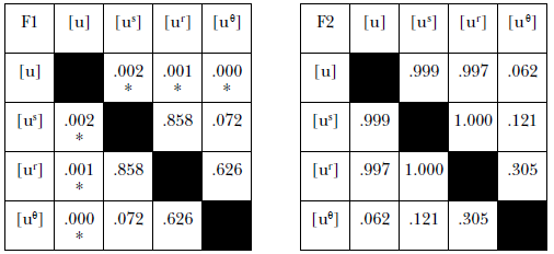 Como podemos apreciar en la Tabla 9, la diferencias en cuanto al F1 en las cuatro realizaciones de /u/ son estadísticamente significativas en los contrastes [u] - [us], [u] - [ur] y [u] -[uθ], pero no en [us] - [ur], [us] - [uθ] o [ur] - [uθ]. Ningún contraste es estadísticamente significativo en cuanto al F2 de las cuatro realizaciones de /u/ analizadas. Así, se puede afirmar que, en andaluz oriental, /u/ tiene dos alófonos en posición final de palabra: /u/ en posición final de palabra ([u]) y /u/ ante /s/, /r/ o /θ/ final apocopada ([us/r/θ]).