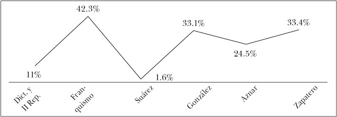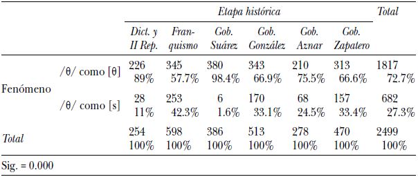 En cuarto y último lugar se sitúa la etapa histórica, que muestra porcentajes muy distintos en la elección de la solución distinguidora o seseante el seseo, por ejemplo, goza de su más alto índice de aparición en el Franquismo (42.3%), pero llega a su porcentaje más bajo en la etapa inmediatamente posterior, el gobierno de Adolfo Suárez (1.6%). En general, aunque en todas las épocas predomina la distinción, parece que los gobiernos más conservadores de la etapa democrática más reciente apuestan por ella en un porcentaje mucho más elevado: hay una diferencia de un 31.5% entre los gobiernos de Adolfo Suárez y Felipe González, y de un 8.6% entre los de este último y José María Aznar, por ejemplo. Como hemos dicho, el caso del Franquismo es particular ya que, a pesar de ser la etapa más conservadora, es también la que más patrocina el seseo. Hemos aventurado varias hipótesis que van desde la poca relevancia de los medios de comunicación en la época, pasando por tener en cuenta que se trata de un régimen que no necesita del voto del pueblo para mantenerse en el poder, lo que hace que la imagen lingüística sea menos importante, hasta el apunte de que los nacionalismos europeos se sirven de los regionalismos para construir su espacio ideológico, que en el caso español no pocas veces se identificaba con lo andaluz. Todo ello ayudaría a entender el alto porcentaje de la variedad seseante en esta etapa.