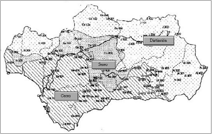 En tal sentido, si desde el punto de vista sociolingüístico encontramos un gran polimorfismo respecto de estas variantes, no resulta más simple la de su reparto geográfico por el territorio andaluz, que no es homogéneo, aunque el ALEA arrojó mucha luz sobre este asunto, y otros autores, encabezados por Navarro Tomás et al. (1933), han delineado una isoglosa que permite localizar los puntos de seseo, ceceo y distinción en la comunidad autónoma andaluza. En el Mapa 1 se pueden apreciar las franjas espaciales en las que se localiza cada solución: