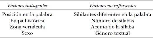 Aunque sabemos que no es estadísticamente representativo, porque los casos de /s/ como [θ] son demasiado pocos, el único factor o variable que resulta significativo mediante la prueba de X2 es aquel que tiene en cuenta si hay más de una sibilante diferente en la palabra: de los ocho casos de ceceo, cinco se dan en palabras que además de una sinicial poseen una interdental (concretamente en sucesivo, preciso -en dos ocasiones- residencia y personal) y tres en palabras que sólo tienen la sibilante s(personal, castrense y se).