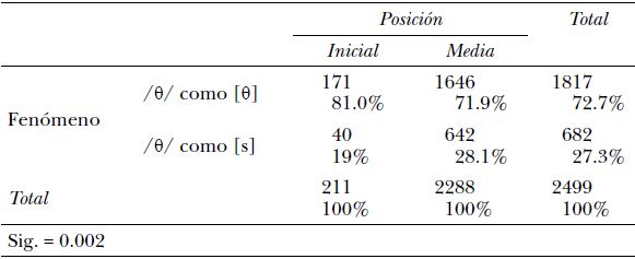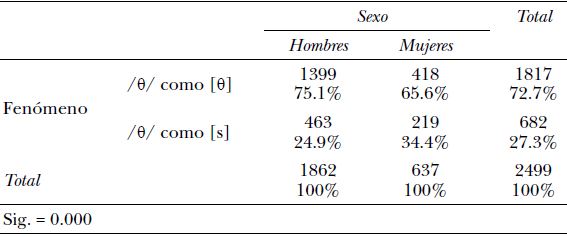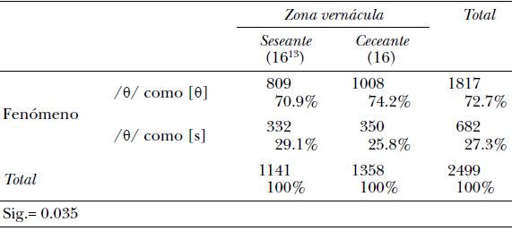 De un total de 2 718 casos estudiados, en 2 036 se mantiene la pronunciación de /θ/ como [θ], y en 682, ésta se pronuncia como [s]. Los resultados reflejan que existe un 25.1% de /θ/ como [s] (seseo) y que la preferencia por la solución interdental es predominante, ya que supone un 74.9% del total.