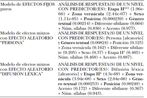 Por lo demás, como comentábamos anteriormente, presentamos dos modelos de efectos mixtos, uno que considera los factores fijos estudiados hasta ahora, en combinación con la variable aleatoria “persona”, y otro con la variable aleatoria “difusión” o “ítems léxicos”. Inicialmente, presentaremos la significatividad arrojada por cada uno de los tres modelos tenidos en cuenta y, posteriormente, pasaremos a comentar de manera individual aquellos que consideran las nuevas variables. En la Tabla 7 se pueden ver los resultados de la significatividad de cada uno de ellos:
