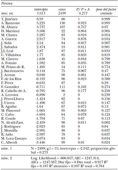 En el primer caso, para los resultados de los individuos o personas, tenemos que de los 32 presidentes y ministros considerados (recordemos que hemos eliminado 3 de zona vernácula distinguidora), 15 ofrecen coeficientes positivos, por lo que favorecen el seseo: Trinidad Jiménez, Adolfo Baturone, Magdalena Álvarez, Diego Martínez Barrio, Manuel Chaves, Alfonso Guerra, José Solís, Julio Salvador, José Luis Leal, Celia Villalobos, Manuel Clavero, Antonio Fontán, Miguel Primo de Rivera, José Barrionuevo y Javier Arenas. Por su parte, 16 de ellos arrojan coeficientes negativos: Fernando de los Ríos, Félix Pérez Miyares, Felipe González, Rafael Cabello de Alba, Alejandro Lerroux, José Pedro Pérez-Llorca, José Utrera, Rosa Aguilar, Manuel Pimentel, Carmen Calvo, Rosa Conde, Niceto Alcalá-Zamora, José Montilla, Bibiana Aído, Manuel Lora-Tamayo y Cristina Alberdi. La tabla presenta los coeficientes ordenados del más alto al más bajo, por lo que la ministra que más favorece el seseo es Trinidad Jiménez y, la que menos, Cristina Alberdi.