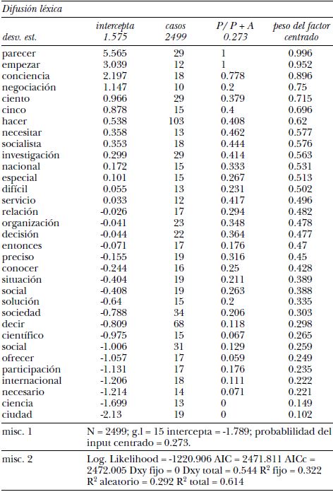 Para el segundo predictor de carácter aleatorio, el referente a los ítems léxicos, tenemos que de los 33 considerados, 14 presentan un coeficiente positivo, es decir, favorecen el seseo, en tanto que para 19 ítems es negativo y, por tanto, lo desfavorecen. El primer grupo está encabezado por los términos parecer y empezar, en que /θ/ siempre se pronuncia como [s] con una probabilidad de 1; ocurre lo contrario en los términos ciencia (en ambas posiciones) y ciudad, en que /θ/ es [θ] siempre. Es curioso que en el primer caso la sibilante se halle en mitad de palabra, mientras que en el segundo la tengamos en posición inicial (y en el caso de ciencia, también media), lo que viene a reafirmar la influencia de la posición de la sibilante en la palabra. En este caso, recordemos, sí que resultaron significativas las variables que lo hicieron en el análisis bivariante inicial, además del género textual.