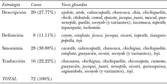 Frente a éstas, las 35 voces restantes (ajolote, atole, cacastle, calancapatli, chacaana, chancaca, chía, chichigua, chichiquelite, chicle, chileatole, chicozapote, comal, coyote, cumeme, epazote, estafiate, guayacán, jicaco, jocoqui, juari, mescal, nenepile, oivari, quanenepile, quelite, quinaquina, saguaidodo, socoyole [y variantes], tacamaca, tapestle, tequesquite, tianguispepetla, tochomite, toji) presentan algún tipo de glosa en el texto, y en este grupo aparecen tanto algunos antillanismos y nahuatlismos de uso menos frecuente -a manera de ejemplo, guayacán, jicaco, cacastle o socoyole-, como todos aquellos vocablos que el jesuita toma de las lenguas del norte del país (chacaana, cumeme, juari, oivari, saguaidodo, toji), algo que probablemente responde al “razonable temor de que sus lectores sean incapaces de comprenderlas” y que, por tanto, “parece poner de manifiesto un menor grado de integración de tales elementos en la variedad del español de la región o, al menos, su carácter diatópicamente mucho más restringido” (Ramírez Luengo, en prensa)6.