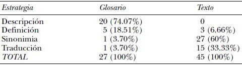 Como se puede apreciar, el análisis pormenorizado de estas dos partes que componen el Florilegio muestra no sólo diferencias de peso respecto a los datos generales apuntados más arriba, sino también -y más importante aún- claros contrastes entre ambas en lo que se refiere a las estrategias que Esteyneffer utiliza de manera más frecuente a la hora de explicar los indigenismos. De este modo, mientras que en el glosario el procedimiento claramente preferido es la descripción (con casi tres de cada cuatro casos) y, en menor medida, la definición, en el caso del texto expositivo la situación es exactamente la inversa, habida cuenta de que el porcentaje mayoritario se encuentra en el campo de la sinonimia y la traducción, que juntas alcanzan el 90% del total. En ambos casos, las estrategias minoritarias -sinonimia y traducción en el glosario; definición en el texto- resultan puramente testimoniales, al reducirse a porcentajes de entre el 2% y el 6% del total12.