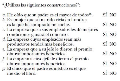 Como puede observarse, en el ejercicio he incorporado usos en que cuyo encabeza un sintagma con función de sujeto (d y j) o un sintagma preposicional con función de complemento indirecto (f ). Con las mismas funciones, he incluido ejemplos de que su (sujeto: b, i; complemento: e). Asimismo, he incluido una oración canónica con que a sus (c): se trata de una construcción un tanto costosa por el orden de palabras, pero me ha permitido ver si los hablantes la rechazaban por la presencia de esta secuencia. También he mostrado un ejemplo como ejercicio de control (a); otro con un uso erróneo de cuyo (h); y, por último, un ejemplo con artículo (g) que me permitirá observar, como hacía DeMello (1992), si los informantes usan también otros reemplazos para cuyo, aparte del quesuismo.