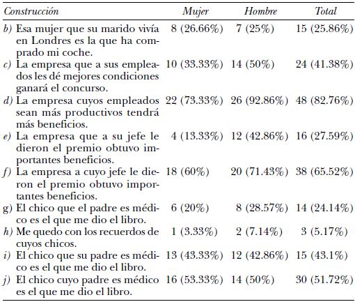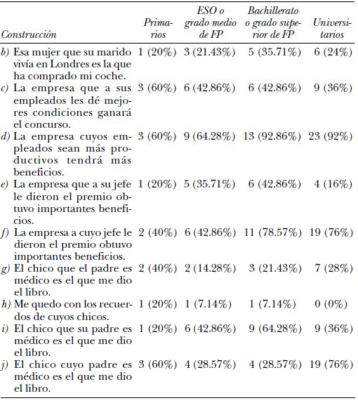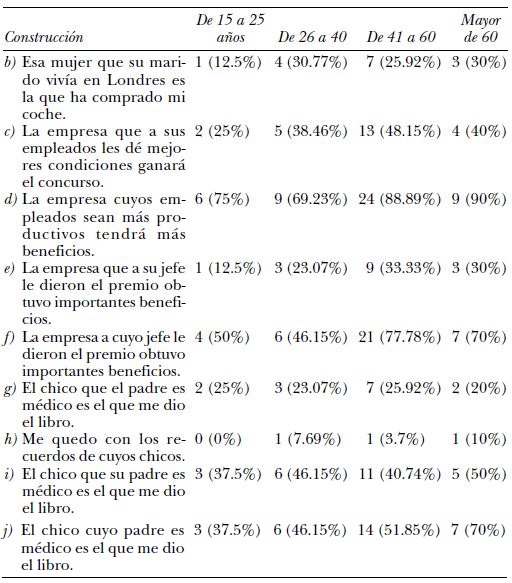 Les siguen en frecuencia de uso “El chico que su padre es médico es el que me dio el libro” (utilizada por 25 informantes, lo que equivale a un 43.1%); “La empresa que a sus empleados les dé mejores condiciones ganará el concurso” (24 = 41.38%); “La empresa que a su jefe le dieron el premio obtuvo importantes beneficios” (16 = 27.59%); “Esa mujer que su marido vivía en Londres es la que ha comprado mi coche” (15 = 25.86%); “El chico que el padre es médico es el que me dio el libro” (14 = 24.14%)20; por último, “Me quedo con los recuerdos de cuyos chicos”, que sólo usan 3 informantes (5.17%)21.
