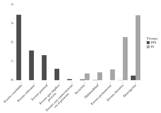 Asimismo, en la lectura de la Gráfica 1, advertimos que el atributo de mayor peso en el PPS es el de “evento concluido”, y el de menor peso, el de “evento con consecuencias en el presente”. También encontramos usos marginales del atributo “descripción”, lo que acerca el PPS a los valores del PI y produce, por tanto, una superposición de categorías. El atributo de mayor peso en el PI es de hecho el de “descripción”; el de “iteración”, en cambio, se perfila como el de menor peso.