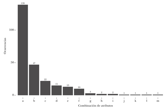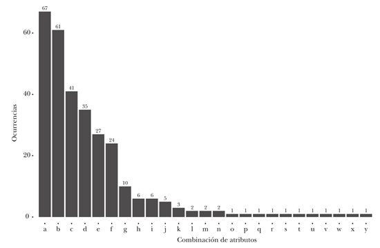 En la Gráfica 2, vemos que en el eje horizontal aparece cada combinación de atributos representada por una letra del alfabeto. En el eje vertical se muestra el número de ocurrencias. En seguida, desplegamos el significado de cada letra, es decir, de cada conjunto de atributos (se destacan en negrita los que aparecen con mayor frecuencia en el corpus), y ofrecemos entre paréntesis el número de ocurrencias, después del cual ilustramos con un ejemplo: